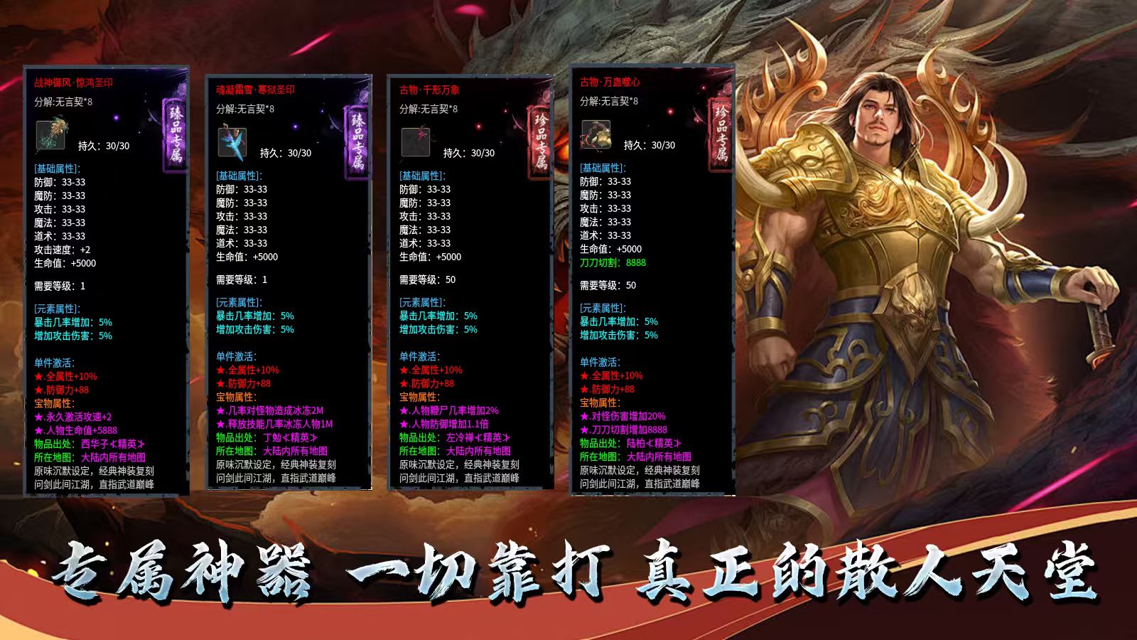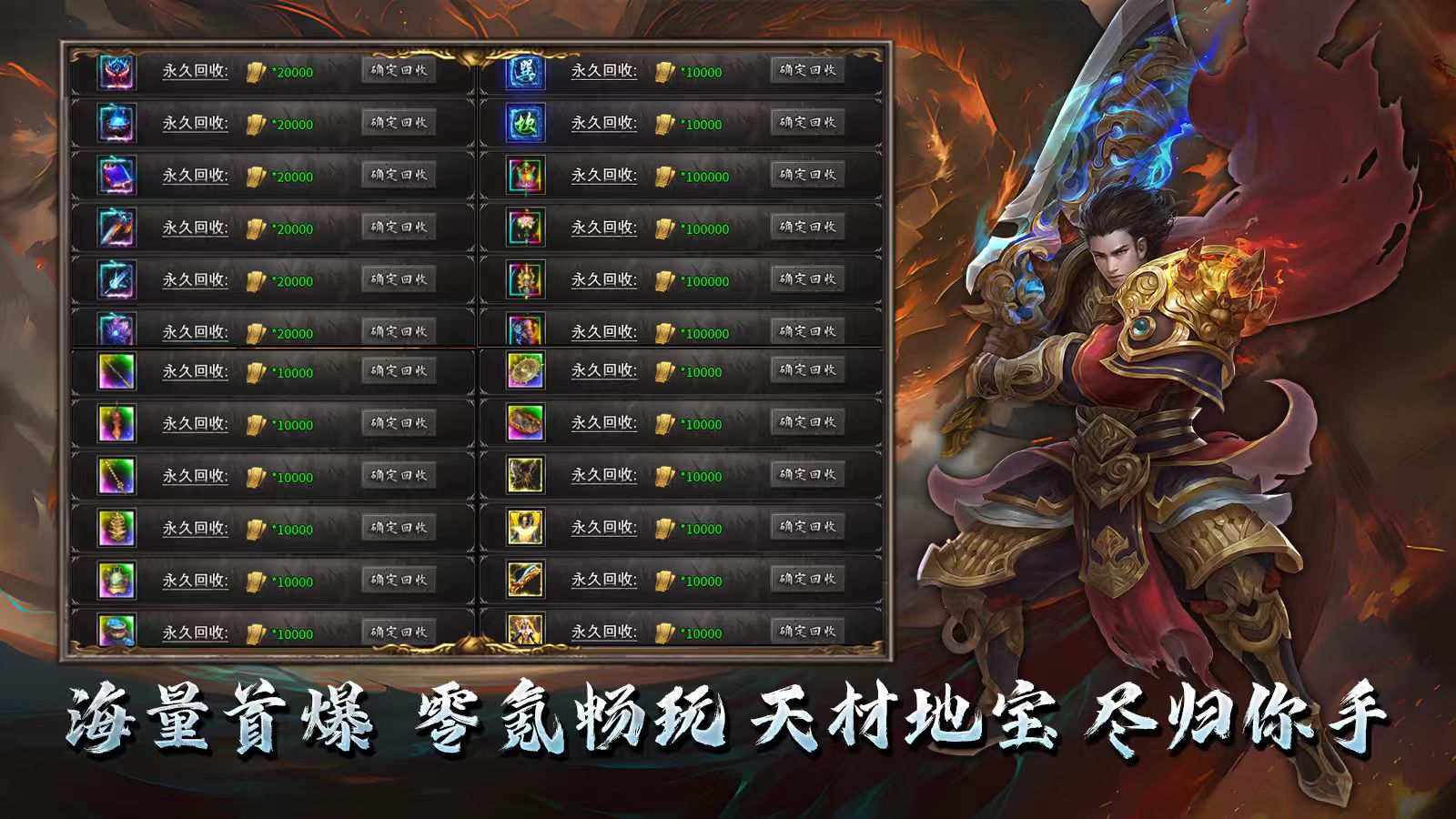 盟重宝藏128元: 元宝*3w 雇佣兵证明 *6 勋章之心 *8 范围拾取*1 自动回收*1